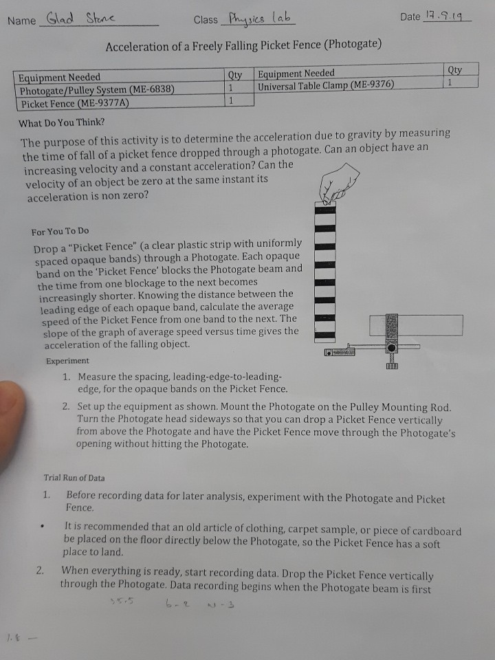 Picket fence free fall lab. The purpose of this lab was to measure the acceleration of a free falling object by using the slope of a velocity vs. It is nearly constant. You must not forget to include any extra details which may be beneficial for readers.